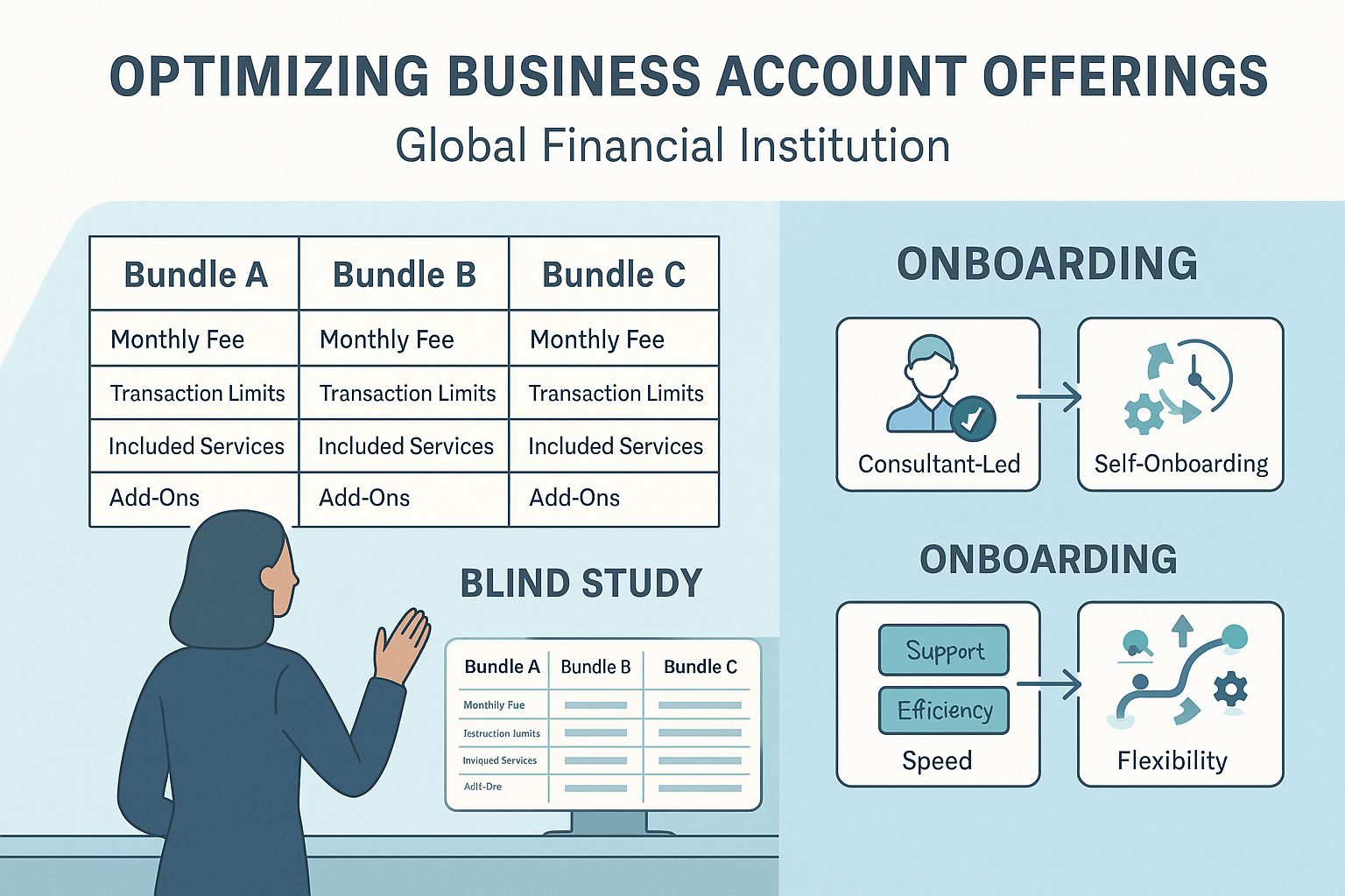 The client wanted to understand how corporate customers evaluate different business banking product bundles and whether onboarding style impacts their institution choice. The study compared bundles from three major financial institutions (blinded) and tested two onboarding approaches: traditional consultant-led setup and self-implementation.